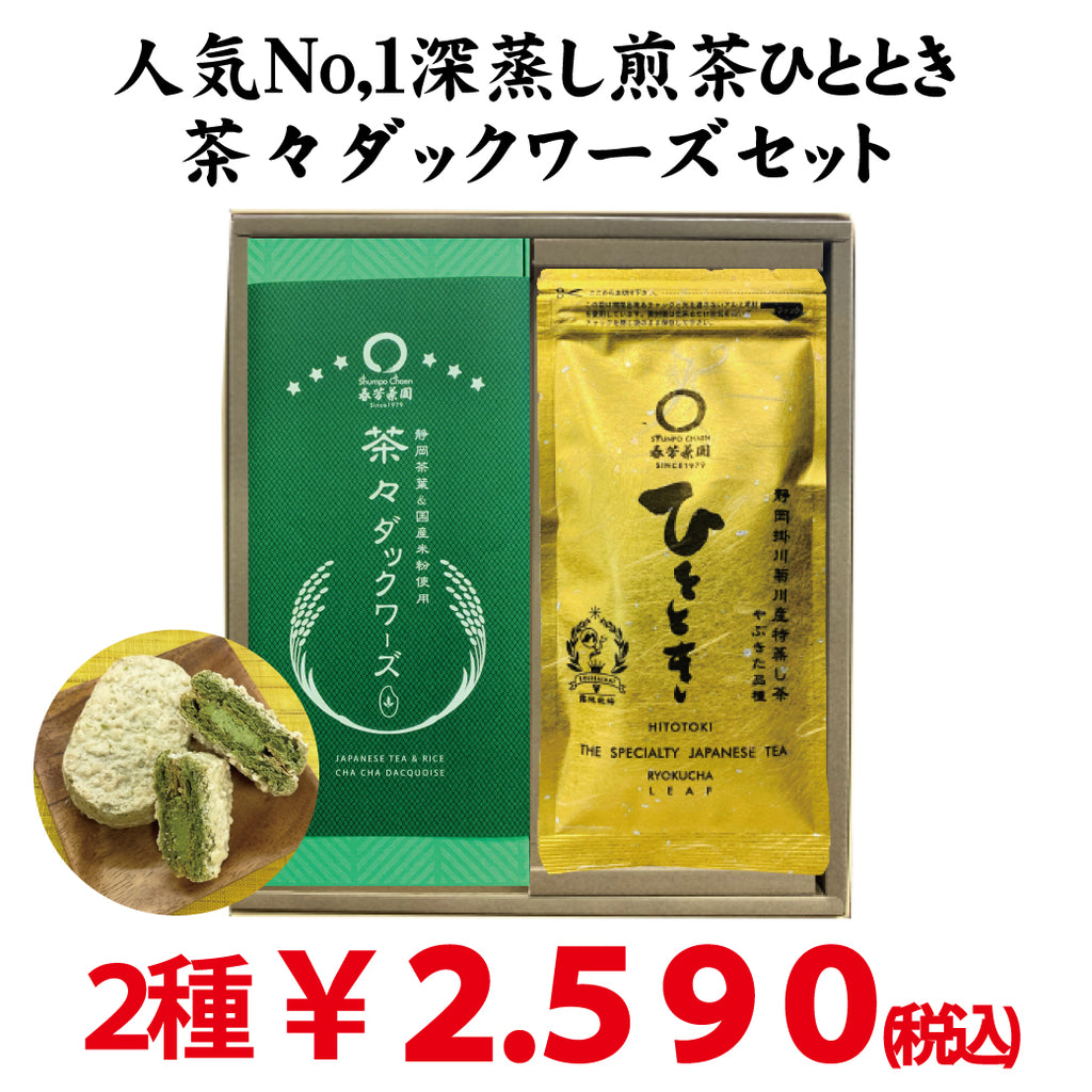 春芳茶園のNo,1深蒸し緑茶「ひととき」80g詰と人気のお菓子茶々ダックワーズ6個入りの贈答セットです。茶々ダックワーズは米粉にお茶のクリームを挟んだ周りはサクッと中は柔らかいお菓子です。 心から楽しんでいただける贈答セットです。