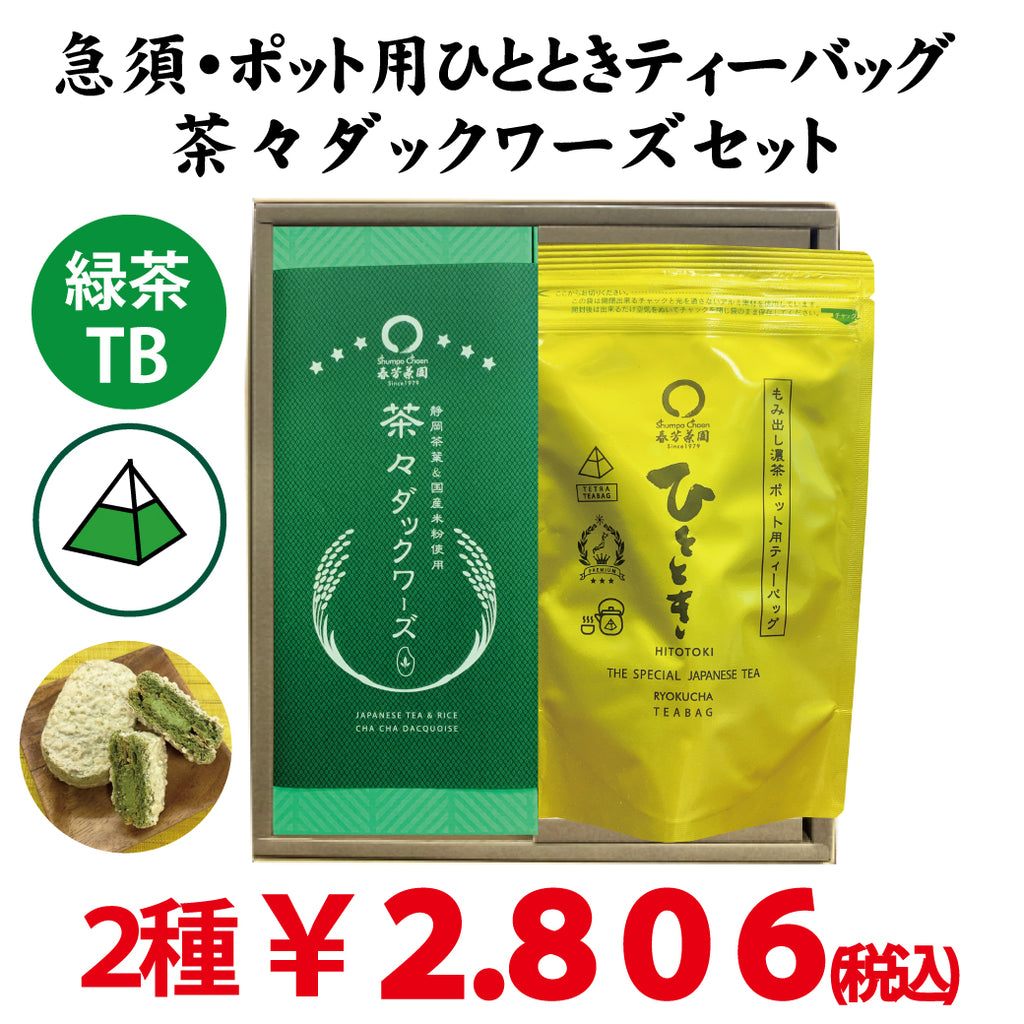 人気NO.1煎茶「ひととき」のテトラ型ティーバッグとお茶たっぷり茶々ダックワーズとの組み合わせセットです! 「ひととき」テトラ型緑茶ティーバッグは、お急須やティーポットを使い、1Pで2人から3人分抽出できます。茶々ダックワーズは米粉にお茶のクリームを挟んだ周りはサクッと中は柔らかいお菓子です。 心から楽しんでいただける贈答セットです。